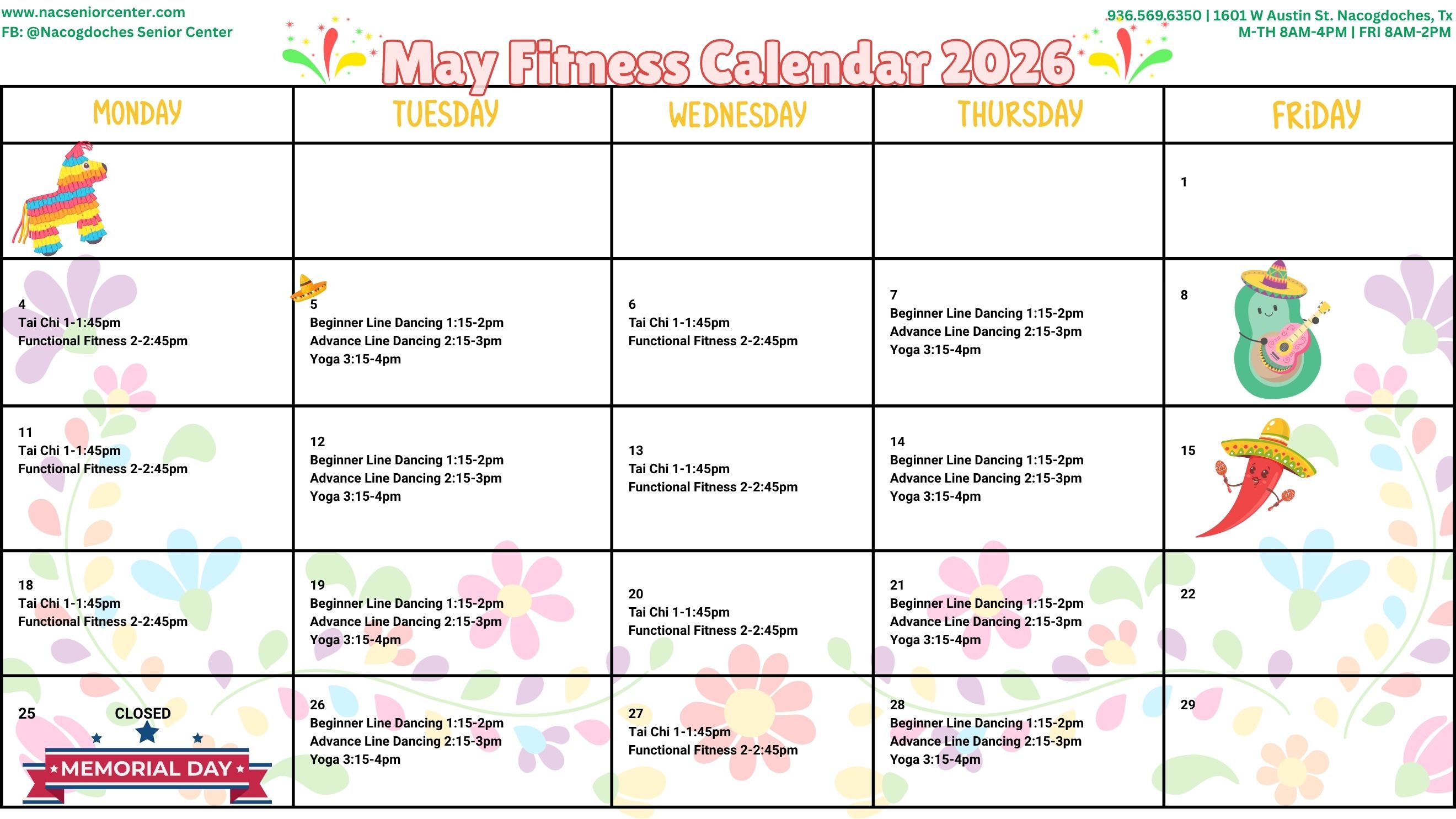 Every Monday and Wednesday from 2–2:45 p.m., our Functional Fitness class helps build strength, mobility, and coordination through low‑impact movements that mirror everyday activities. This total‑body workout is designed to support independence and is suitable for most fitness levels.
